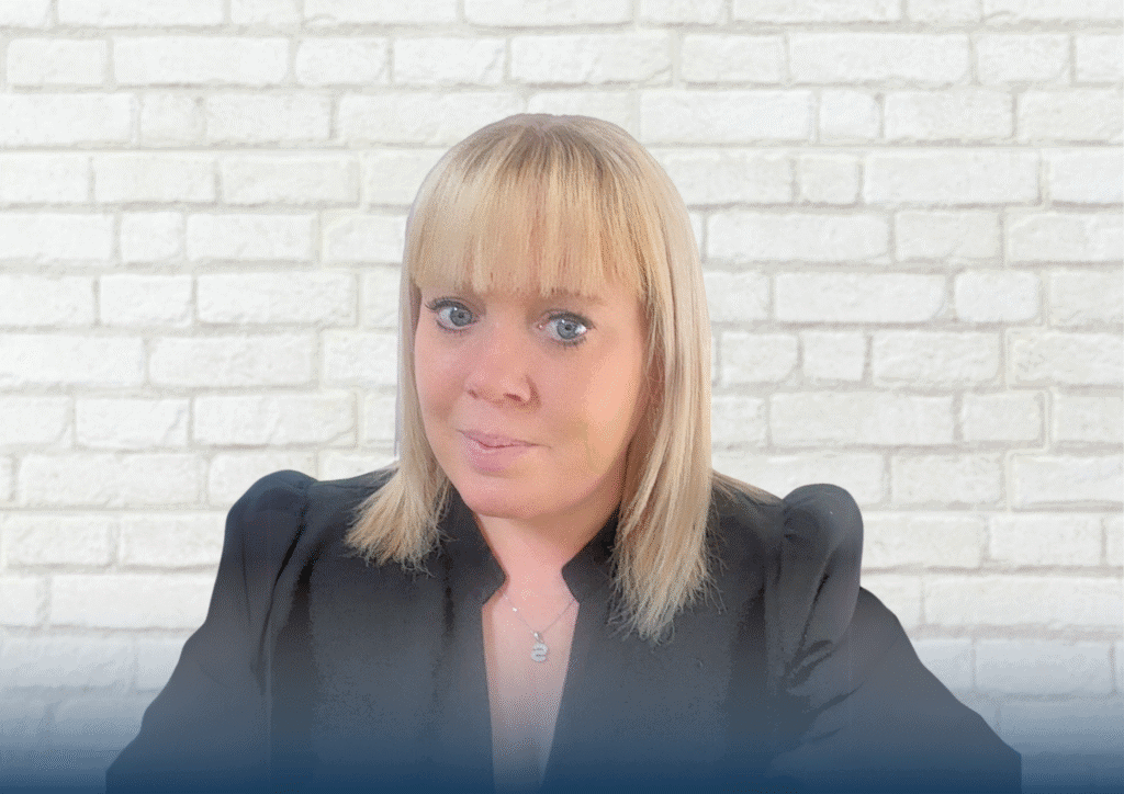 Karen, a woman with white blonde hair wearing a baby blue suit jacket sits against a white background